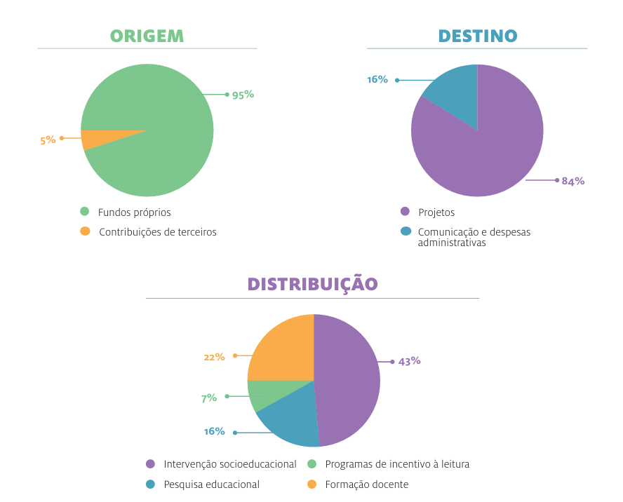 A origem dos recursos corresponde a 95% de recursos próprios e 5% de contribuições de terceiros.